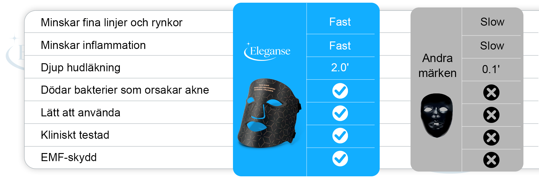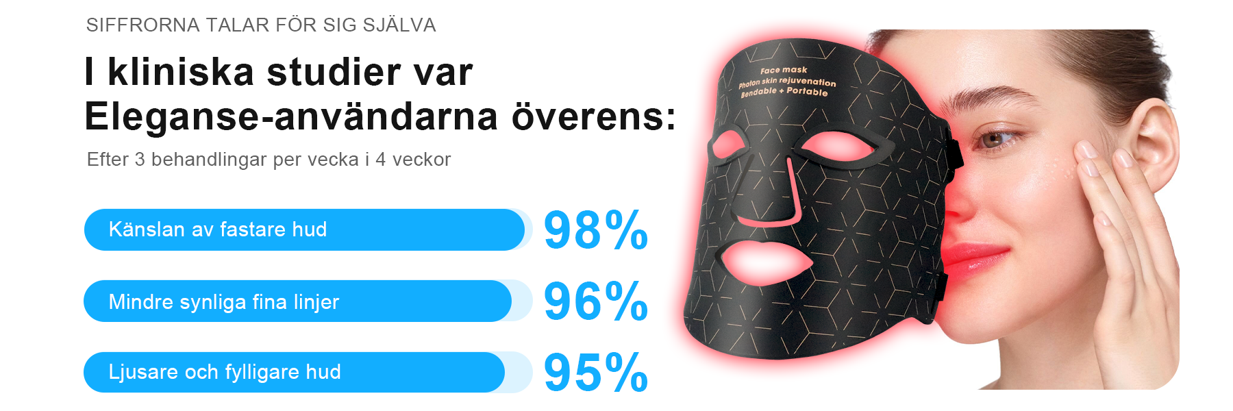 Därför är varje funktion i Eleganse LED-mask – från den smarta, handsfree-designen till den målinriktade fototerapin och den bekväma silikonpassformen – skräddarsydd just för dig. Det är inte bara ett skönhetsverktyg, det är din personliga ”glödåterställare” som hjälper dig att enkelt förvandla din hud och återfå din lyster. Välj Eleganse LED-mask för att enkelt njuta av varje ögonblick av självvård.